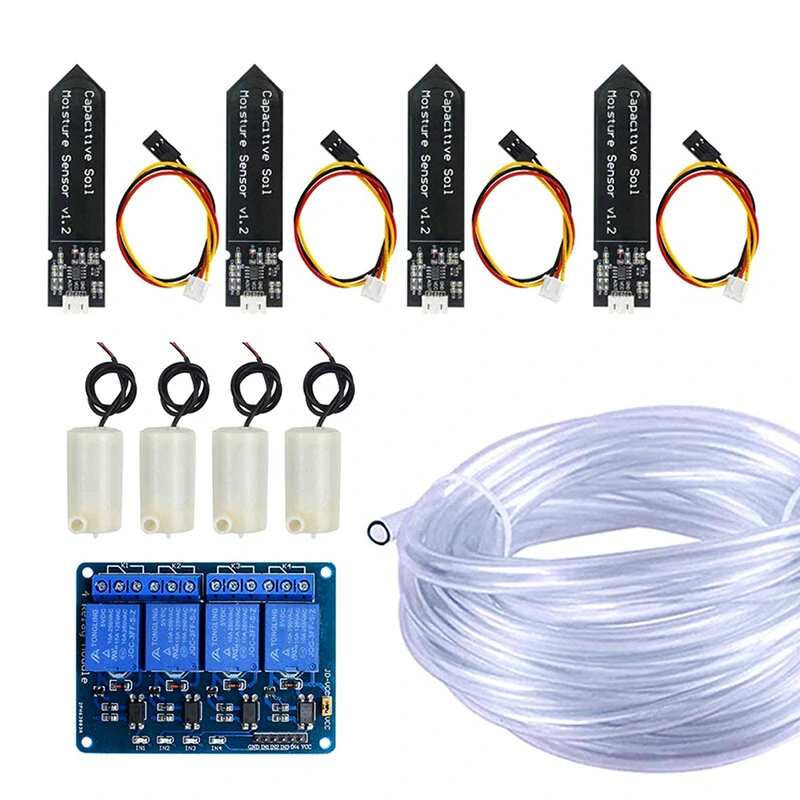 - Kapacitiv jordfuktighetssensor: Mäter fuktighetsnivåerna i jorden och aktiverar pumpen vid behov.