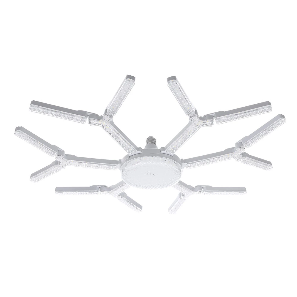 Specifikation:Typ: 6 bladEffekt: 120WSpänning: AC85-265VLED-kvantitet: 200LEDBas Typ: E27Ljusfärg: Vit ljus 6500~7000KLivslängd: 30 000 timmarMaterial: Akryl, ABS, PSExpansionsstorlek: 750*150mmFunktioner:- Unik Fällbar Snöflinge-design: Denna LED-taklampa har flera justerbara blad som vecklas ut till en snöflinge-liknande form. Varje blad böjer fritt, vilket gör att du kan skapa olika stilar för dekoration eller belysningstäckning.- Bredvinkelbelysning med hög ljusstyrka: Den stora belysningsytan och multi-blad layout ger starkt,jämnt ljusflöde. Idealisk för vardagsrum,sovrum,matplatser,garage,butiker,stormarknader och arbetsutrymmen från 10-30 m².- Justerbar Blads för anpassad belysning: justera varje blad att expandera eller fälla ljuset enligt dina behov. Byt enkelt mellan kompakta ljuskällor för små rum eller full expansion för belysning av stora ytor.- Enkel E27-installation och universell spänning: Designad med en standard E27-bas och AC 85-265V-kompatibilitet, installeras denna lampa på några sekunder-inga verktyg krävs. Lämplig för de flesta hem- och kommersiella armaturer.- Lång livslängd och praktiskt material: Tillverkad av kvalitetsakryl och plast för stabil prestanda och lång livslängd. Perfekt för vardagsbelysning i hem, butiker, lager, verkstäder och mer.Förpackningen innehöll:1 x E27-lampa