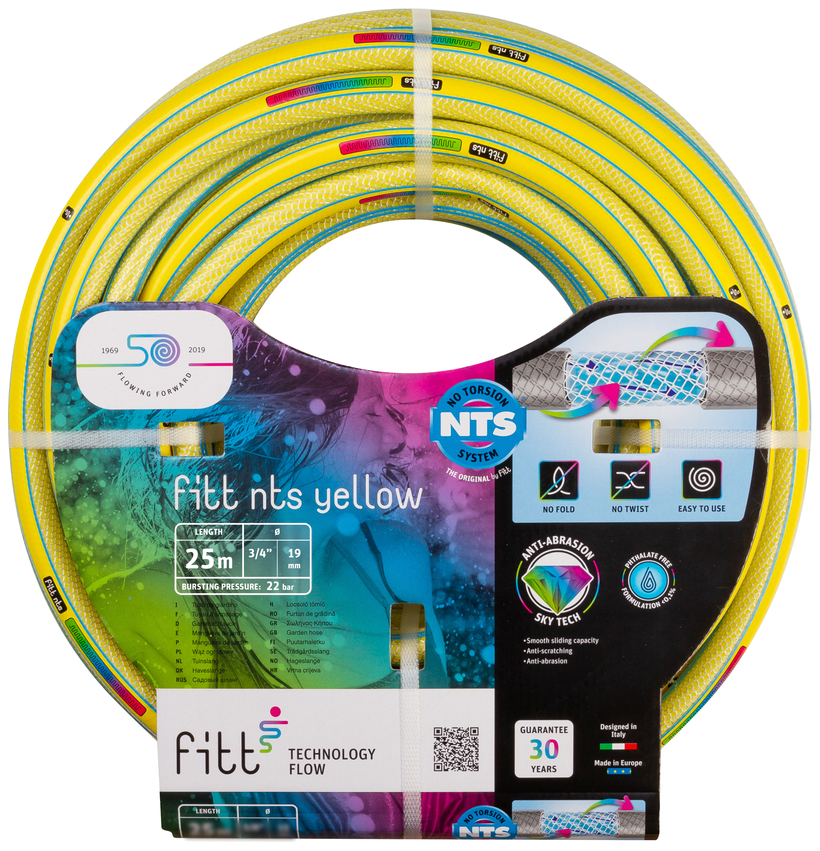 Denna vandslange är tillverkad av sex lager material som säkerställer enastående hållbarhet och långvarig användning. Den innovativa NTS (No Torsion System) textilteknologin förhindrar effektivt att slangen knäcks och trasslar sig, vilket garanterar ett konstant och oavbrutet vattenflöde.