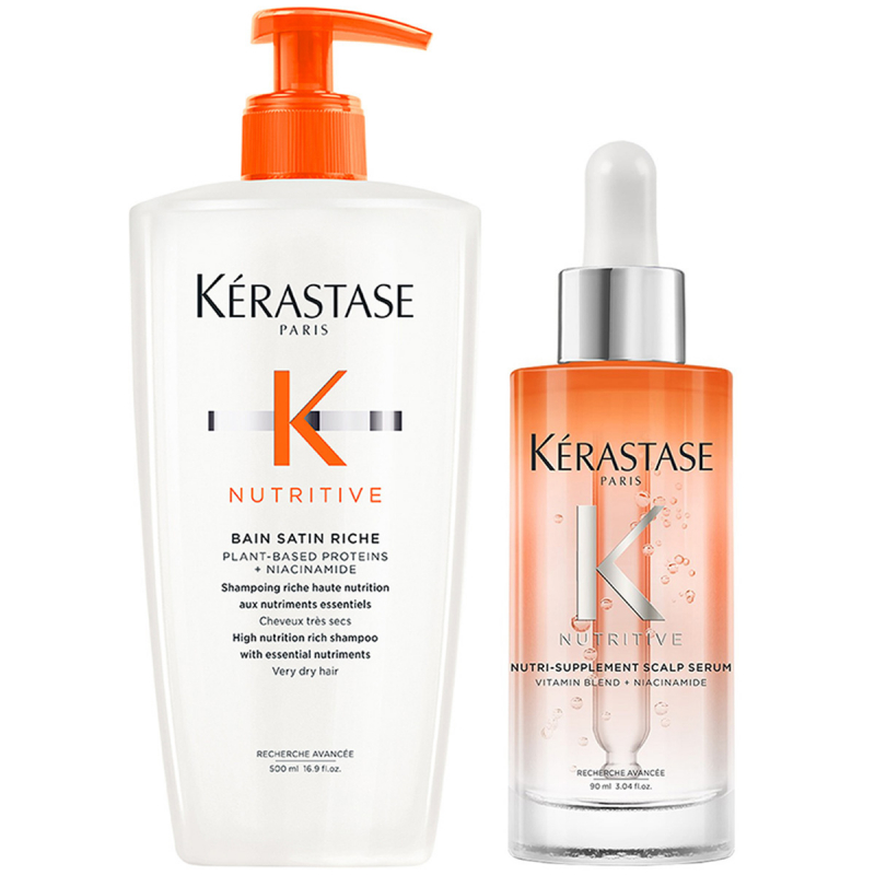 Setet innehåller Kérastase Nutritive Bain Riche Shampoo (500 ml) och Kérastase Nutritive Scalp Serum (90 ml).