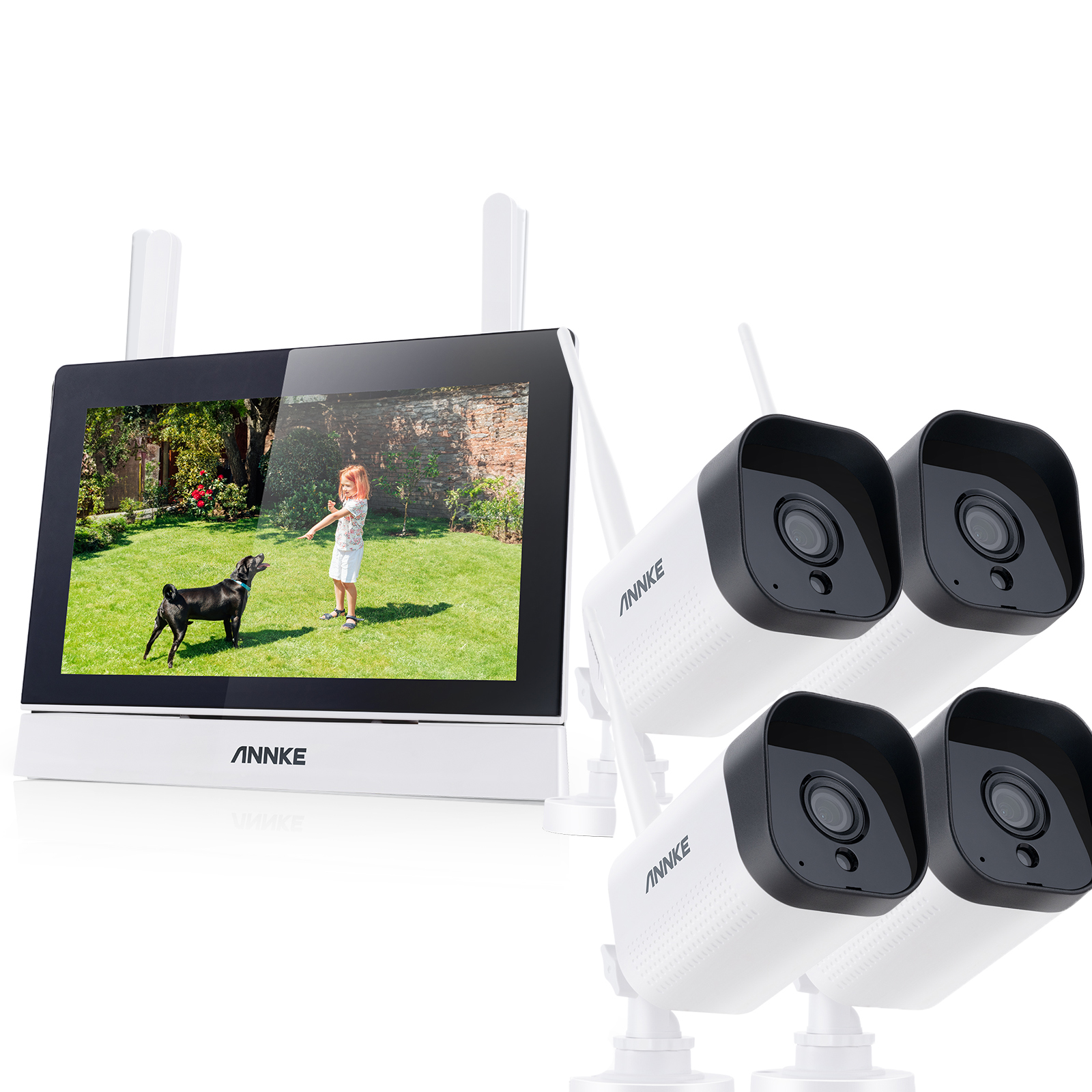 Övervakningspaket med 4st Trådlösa Utomhuskameror, WIFI, IP66, 7″ NVR Skärm, iOS/Android, Alexa, 3mpx, mörkersyn