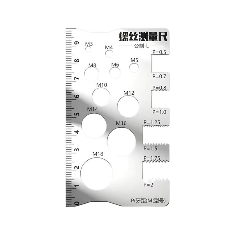 Specifikationer:Produktnamn: TrådtjocklekMaterial: Högkvalitativt 304 rostfritt stålDimensioner: Ungefär 10 x 5 cm / 3.94 x 1.97 tumVikt: Ungefär 35 gFunktioner:1. Robust komposition i rostfritt stål: Tillverkad med premium 304 rostfritt stål för långvarig prestanda i krävande miljöer, vilket erbjuder hög motståndskraft mot slitage, korrosion och miljöfaktorer.2.Effektiv fler-mätningsdesign: Kombinerar ett precist identifieringssystem med en dubbel-skala mätalternativ,vilket ger mångsidighet för olika trådspecifikationer i ett enda verktyg.3. Tydlig dubbel skala kalibrering: Funktioner med väl ingraverade numeriska markeringar med dubbel skala integrering,vilket möjliggör mycket exakta avläsningar samtidigt som det minimerar användarfel vid storleksidentifiering.4. Platsbesparande portabilitet: Designad med lätta, kompakta dimensioner och en halkskyddad yta, vilket gör den idealisk för bekväm transport och pålitlig hantering över olika arbetsytor.5. Bred tvärindustriell tillämpning: Utformad för att täcka ett brett spektrum av fästelement, vilket främjar sömlös anpassning i hantverk, hem och industriella uppgifter för trådmatchning och skruvmodellidentifiering.Förpackningen innehöll:1 x Gängmått