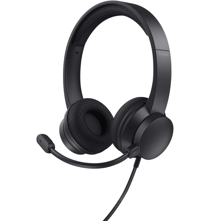 Trust Ayda USB-ENC PC-headset – USB-anslutning, On-ear USB PC-headset med låg vikt och brusreducerande mikrofon och justerbar huvudbygel, Buller ut, röst in, Se till att dina idéer alltid blir hörda med Ayda ENC Headset. Headsetet har en brusreducerande mikrofon som tar bort störande bakgrundsljud och säkerställer att din röst uppfattas högt och tydligt. Ditt ekologiska kontor, Detta headset är tillverkat av 65 % återvunnet material och tar dig ett steg närmare en grönare arbetsmiljö, så att du kan göra ditt bästa på jobbet samtidigt som du gör ditt bästa för planeten!, Hitta ditt ljud, Dyk in i möten med fullständig bekvämlighet med Ayda. Med volymknapp på örat och mikrofon som kan fällas in och stängas av har du alla kontroller du behöver för att få ut mesta möjliga av dina onlinemöten och videosamtal. På väg mot framgång, Dagarna med headset som klämmer åt huvudet är sedan länge förbi – njut av komfort hela dagen med det här headsetet, som är utformat med dig i åtanke. Med ett justerbart huvudband, bekväma öronkuddar som andas, mjuka tygkuddar och en lättviktsdesign är Ayda perfekt för videosamtal!, Enkel anslutning, Blev du överraskad av mötesmeddelandet? Det är ingen fara! Anslut bara headsetet via den bekväma USB- och USB-C-anslutningen, som är kompatibel med alla bärbara datorer och PC, så är du redo att börja på nolltid. Specifikationer: Plastmaterial: ABS, Hållbarhetsmetod: PCR, Återvunnet innehåll: 65%, Typ av anslutning: Trådbunden, Typ av anslutning: USB-A, USB-C, Typ av kontaktdon: Rak, USB-version: 1.1, 2.0, 3.0, Kabel stil: Rund, Kablar ingår: 180 cm fäst på headsetet, Storlek på drivelement: 40 mm, Drivrutinsenheter: 2, Frekvensåtergivning: 20 Hz, 20.000 Hz, Mikrofon: Ja, Ljudåtergivning: Stereo, Ljudkanaler: 2.0, Särskilda funktioner: ENC – Environmental Noise Cancelling-mikrofon, Tillbehör till mikrofonen: Pop-filter, Reducering av bakgrundsljud: Ja, Typ av öronkåpa: On-ear, Aktiv brusreducering: Ja, Konstruktion av öronkåpa: Stängd, Typ av magnet: Neodymium, Utgångskanaler: 2, Total harmonisk distorsion: 1 %, Material i öronkåpa: Syntetiskt läder, Justerbart huvudband: Ja, Vikt: 141 g, Höjd på huvudprodukten: 170 mm, Djup på huvudprodukten: 65 mm, Bredd på huvudprodukten: 155 mm, Strömkälla: USB, Kompatibla programvaruplattformar: Windows, MacOS, Kompatibla enhetstyper: Bärbar dator, PC, Lämplig för: Affärsanvändning, Samtal, Daglig användning, Handsfree-samtal, Hem, Kontor, Kompatibilitet generellt: USB-A, Reglage på öronkåpan: Ja, Fjärrkontroll: På öronkåpan, Reglage för: Mikrofonen avstängd, volymkontroll, Innehåll i paketet, USB PC-headset, Kabel för USB-C-adapter, Popfilter, Användarhandbok, Systemkrav, Windows 10 eller 11, macOS 11, 12 eller 13, Chrome OS, Fri USB-port.